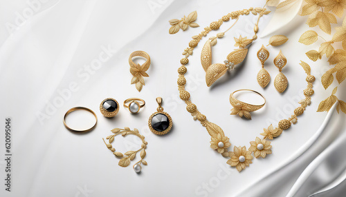 jewellery, gold, copy space, white, gold, metal, bridal, arabic, fragile, elegant, necklace, ring, ring, bracelet, earring, obsidian, black, diamond, gift, present, valentine, anniversary, wedding, pearl, flower, floral, jewellery, yellow, ai, generative, illustration, art, silver, fashion, pearl, luxury, chain, beauty, accessory, jewellery, elegance, shiny, precious, gem