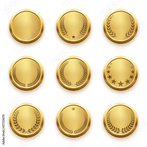 Gold round winner medals with laurel wreath and stars silhouettes set vector illustration. Realistic 3d circle golden medallions for champion, anniversary or jubilee celebration isolated on white