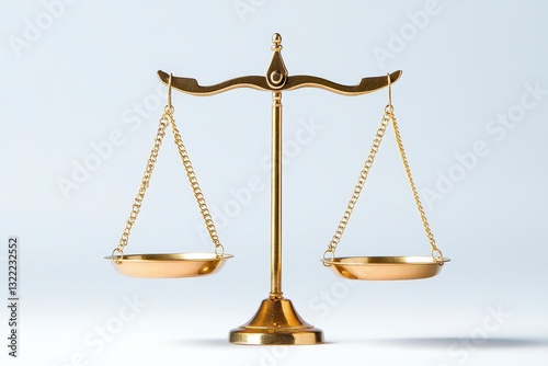 Gold scales of justice on white background, studio shot. Symbol of law, balance, and fairness. Classic design, metallic sheen