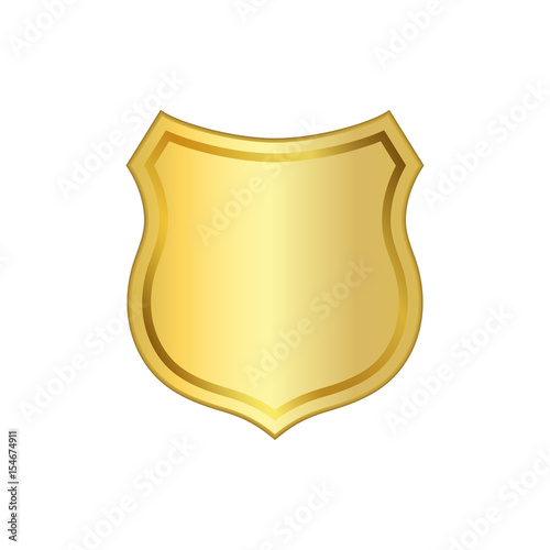 Gold shield shape icon. 3D golden emblem sign isolated on white background. Symbol of security, power, protection. Badge shape shield graphic design Vector illustration