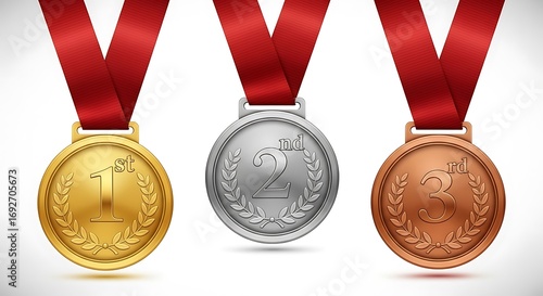 Gold silver and bronze medals with laurel wreaths hang from red ribbons against white