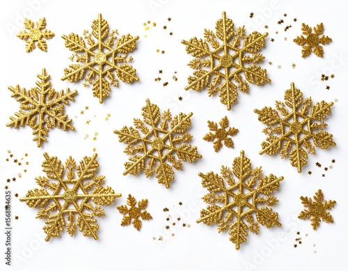 snowflake, gold, winter, christmas, decoration, festive, sparkle, glistering, pattern, design, ornament, christmas, holiday, beautiful, elegant, decor, celebration, season, white, background, top, view