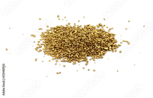 Gold sprinkles isolated on white background top view. Sweet brown glaze decoration or chocolate vermicelli