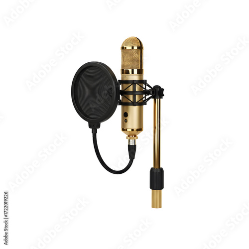 microphone, gold, studio, recording, audio, music, sound, black, equipment, professional, recording studio, vocal, instrument, boom, racked, electronic, technology, digital, sound engineering, broadcast, gold, audio equipment, high-quality, closeup, isolated