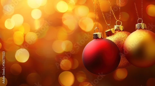 Golden and Red Christmas Ornaments Hanging Against a Sparkling Background