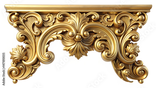 Golden Architectural Embellishment: Exquisite gilded detail with elaborate swirling leaf patterns and intricate decorative flourishes, perfect for adding an opulent touch to any design.