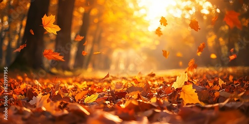 Golden Autumn Forest: Falling Leaves and Sunlight, Warm Nature Scene.