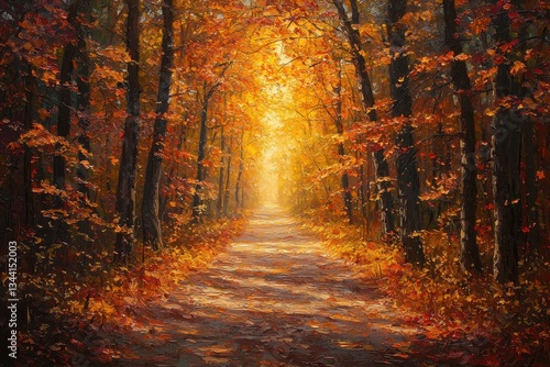 autumn, fall, forest, path, trail, tree, leaf, wood, foliage, season, seasonal, landscape, nature, outdoors, sunlight, gold, orange, red, warm colors, peaceful, serene, idylli, beautiful, scenic, art, painting, oil painting, artistic, canvas, artwork, texture, autumn leaf, fall foliage, sunny, light, shadow, detailed, vibrant, colours, picturesque, tranquil, wilderness, travel, journey, adventure, countryside, country