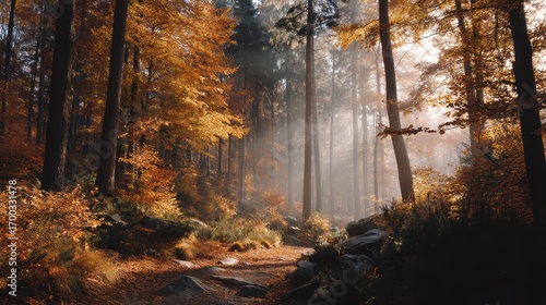 Golden autumn forest with sunbeams streaming through the trees on a misty morning path with fallen leaves