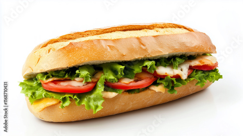 Golden baguette sandwich with crisp lettuce, sliced tomatoes, and melted cheese isolated on white