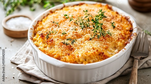 Golden Baked Macaroni and Cheese with Herbs in a Ceramic Dish
