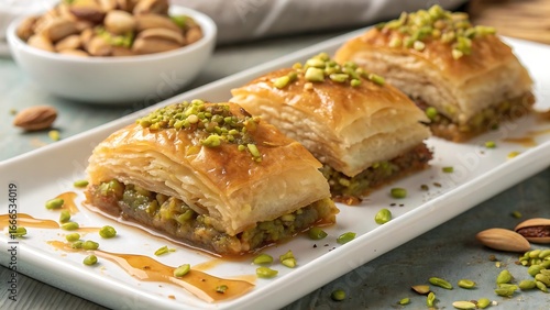 baklava, pastry, dessert, sweet, food, middle eastern, turkish, greek, syrian, lebanese, pistachio, nut, honey, sirup, golden brown, flaky, layer, stacked, white plate, closeup, delicious, traditional, epicure, baked, confectionery, sugar, cookery, snack