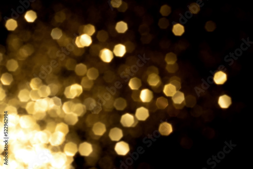 Golden blurred bokeh lights on black background. Glitter sparkle stars for celebrate. Overlay for your design
