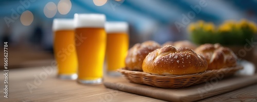 Golden Brew and Buns: A tempting tableau of golden beer glasses and freshly baked, crusty buns rests invitingly on a wooden table, epitomizing the simple pleasures of refreshment and culinary delight.