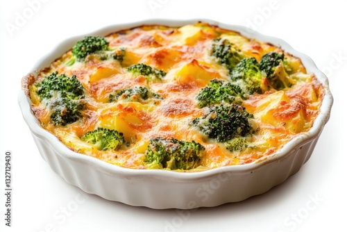Golden broccoli and potato bake in white baking dish oven baked homemade culinary delight