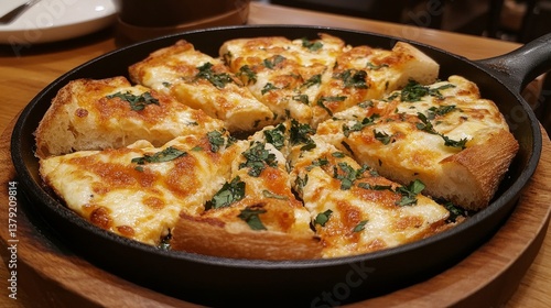pizza, cheese, garlic, bread, food, meal, dish, cookery, delicious, tasty, eatery, dinner, lunch, italian, mediterranean, culinary, gastronomy, baked, gold, brown, crispy, herb, parsley, plaster bandage, iron, frying pan, wooden, footed, warm, comfort, serving, slice, melted, rustic, homemade, epicure, epicure, photo, top, view, close, up, high, angle, shot, styling