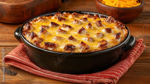 Golden Brown Cheesy Casserole in Dark Skillet on Rustic Wooden Table