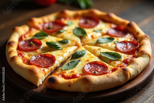Golden brown pizza with salami, stringy cheese pull, rusticpizza, homemade, restaurantfood