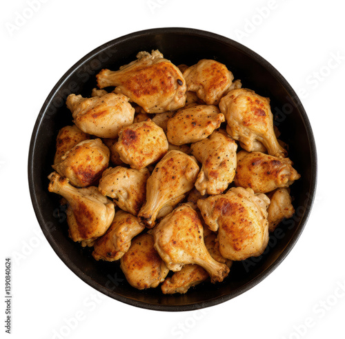 Golden Brown Roasted Chicken Drumettes with Crispy Skin and Savory Seasoning in Cast Iron Skillet Isolated on Transparent and White Background