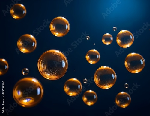 bubble, floating, blue background, element, macro, closeup, liquid, sphere, round, shiny, glistering, sparkle, luxury, elegant, beauty, cosmetic, science, oil, water, light, dark, vibrant, gold, yellow, orange, glossy