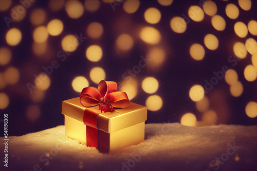 Golden Christmas gift box in a snowy festive winter forest, copy space, gold and glitter, gold ribbons and bows, magic bokeh lights, dreamy, magic atmosphere, New Year and Christmas concept