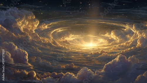cosmic, cloud, spiral, gold, light, sun, heaven, celestial, space, starry, abstract, whirlpool, galaxy, orbit, aura, divine, mystic, mystical, energy, beautiful, bright, radiant, huge, expansive, dreamlike, imaginative, art, image, digital, painting, nature, sky, sunrise, sunset, circular, ring, glow, illuminated, cosmos, immensity, awe, inspiring, hope, serenity, peace