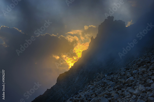 Golden cloudy sunset in the mountains with cliff. View from high altitude.