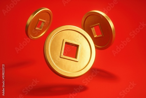 Golden Coin Wealth: A trio of gleaming golden coins float in a dynamic composition against a vivid red backdrop, symbolizing prosperity, wealth, and financial fortune.