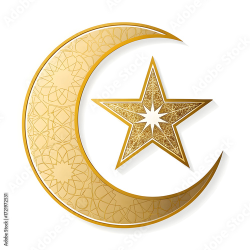 Golden crescent moon and star in Islamic style, rendered as a decorative sticker symbolizing faith, tradition