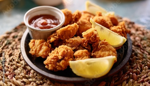 Golden, Crispy Chicken Karaage Served with Lemon Wedges and a Soy-Ginger Dipping Sauce, Captured in a Bright and Vibrant Street Food Setting