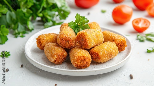croquette, gold, fried, food, meal, snack, plate, cookery, parsley, tomatoes, pepper, dish, tasty, delicious, dinner, lunch, fresh, ingredient, culinary, epicure, homemade, nourishment, white, background, crunchy, brown, organic, vegetarian, healthy, diet, traditional, rustic, portion, small, detail, studio, top, view, close, nobody, mealtime, crispy, light, eat, object, culture, gastronomy, natural