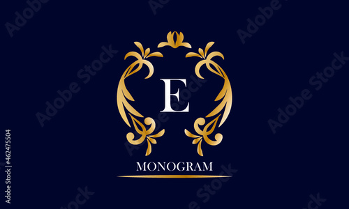 Golden elegant monogram on a black background with the inscription and the letter E in white. Vector heraldic illustration. Luxury ornament sign, restaurant, boutique, cafe, hotel