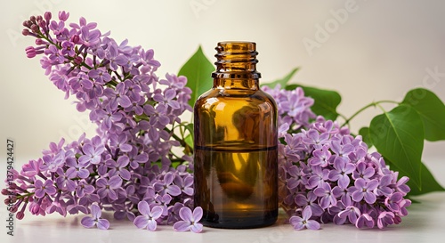 Golden Essential Oil in Amber Bottle with Lilac Blossoms