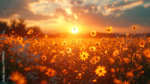 Golden evening on the summer meadow, natural landscape.