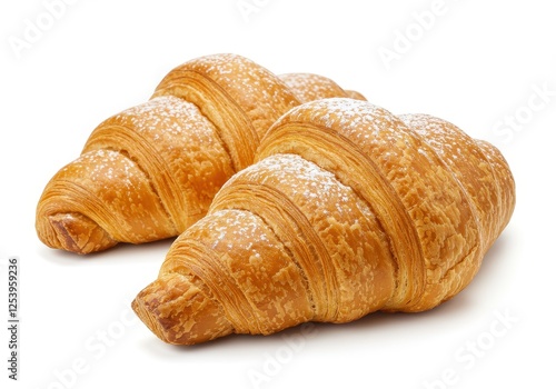 Golden flaky croissants with visible layers and a light dusting of powdered sugar isolated on white background