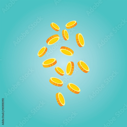 Golden flying coins vector illustration on blue background. Perfect for finance, savings, investment, cryptocurrency, jackpot, wealth, online payment, business and money-related graphic design project