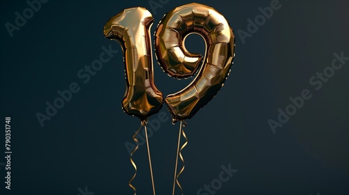 gold, foil, balloon, number, 19, dark background, celebration, milestone, party, birthday, decoration, shiny, metallic, gold, event, festive, nineteenth, anniversary, decorative