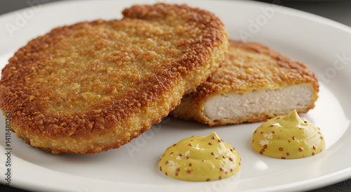 Golden Fried Chicken Cutlets Served With Tangy Mustard Sauce Plate