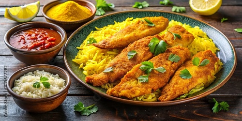 Golden Fried Fish Served on a Bed of Yellow Rice with Green Garnish