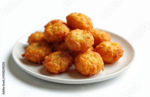 Golden fried pakoras arranged on white plate. Indian cuisine snack. Fried vegetable fritters. Appetizing vegetarian meal option for lunch dinner or party catering. Close-up shot of food texture.
