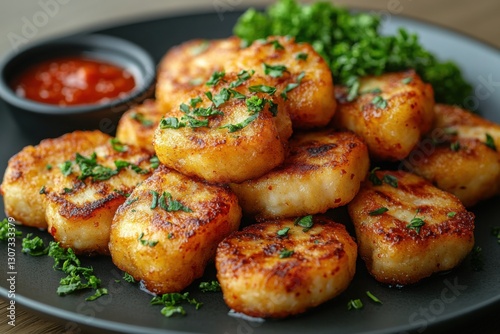 Golden fried potato cakes artfully garnished with fresh parsley Served with a small bowl of flavorful red sauce on a black plate