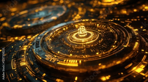 technology, digital, circuitry, futuristic, interface, abstract, gold, glowing, circle, ring, pattern, design, background, texture, dark, shiny, bright, illuminated, complex, intricate, geometric, graphic, science, fiction, elegant, modern, stylish, aesthetic, innovative, advanced, concept, artwork, illustration, computer, generated, three-dimensional, rendering, machine, network
