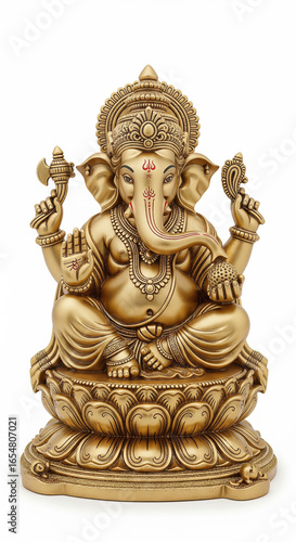 Golden Ganesha statue sitting on lotus base, detailed craftsmanship, four arms holding symbolic objects, serene expression, traditional Hindu religious art, spiritual decor