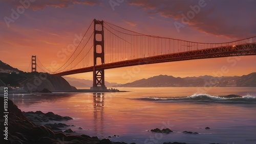sunset, bridge, water, dawn, suspension bridge, dusk, no one, evening, travel, sky, suspension, sea, headland, bay, ocean, strait, connection, seacoast, river, vehicle, landscape, outdoors, beach, architecture, pacific, freezed, silhouetted, city, golden gate bridge, scenic view, colorful sky, landmark, frisco, coastline, iconic