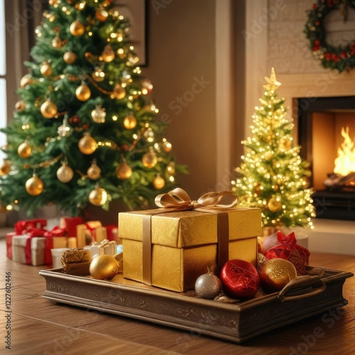 Golden gift box placed on a decorative tray beside a lit fireplace with a beautifully decorated Christmas tree nearby, elegant , golden gift box