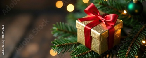 Golden gift box with red ribbon tied around a Christmas tree branch, decoration, gift, festive