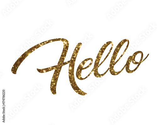 Golden glitter of isolated hand writing word HELLO