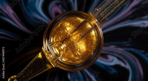 gold, glistering, serum, glasses, bowl, dark, swirling, abstract, liquid, cosmetic, beauty, closeup, macro, texture, shimmer, particle, detail, top, view, gold, transparent, luxury, care, health, product, cosmetic, beautiful, colourful, bright, creative, modern, elegant, stylish, professional, decorative, vibrant, stunning, amazing, marvellously, fantastic, gorgeous, lovely, charming, attractive, impressive, spectacular