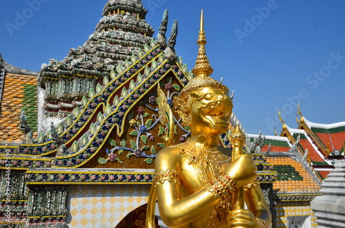 Golden guardian in front of building at Wat Phra Kaew in Bangkok