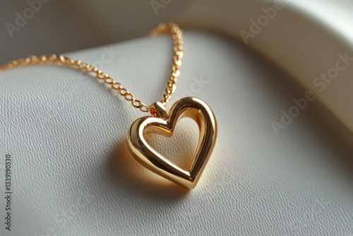 Golden heart shaped pendant necklace displayed on white leather surface, representing love, romance, and luxury